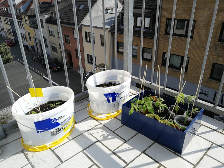 In die Eimer hab ich nun meine Jungpflanzen gesetzt. Auf dem Balkon sieht das ganze dann so aus: