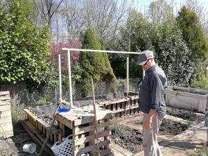Hier sieht man meinen Super Handwerker auch 🙂 Es war ein sehr, sehr heißer Frühlingstag. Die meiste Zeit bin ich im Schatten geblieben. Nur wenn es um Sachen ging, wo ich besser hinkrabbeln konnte, hab ich übernommen 😉 Und so stand das Gerüst relativ fix.