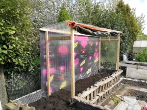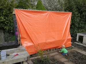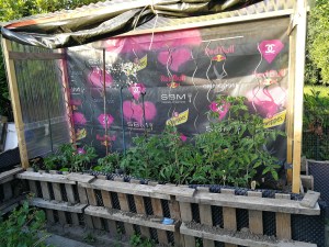 Die Plane im Hintergrund lag schon die ganze Zeit bei uns in der Hütte und ich wollte sie zu gern wegschmeißen. Jetzt bin ich so froh, dass wir die noch behalten haben. Sie ist die perfekte Rückwand für das Tomatenhaus. Uns sind dann allerdings die Schrauben ausgegangen. Deswegen konnten wir die Seiten noch nicht fest machen. Beim nächsten Baumarktbesuch haben wir auch direkt noch eine Plane gekauft, um im Notfall bzw bei Unwetter das Haus komplett dicht machen zu können. Bei uns im Norden ist Unwetter nicht ganz unwahrscheinlich… Ganz zufrieden bin ich damit noch nicht. Eventuell werde ich die Plane doch nochmal mit einer durchsichtigen Plane austauschen.