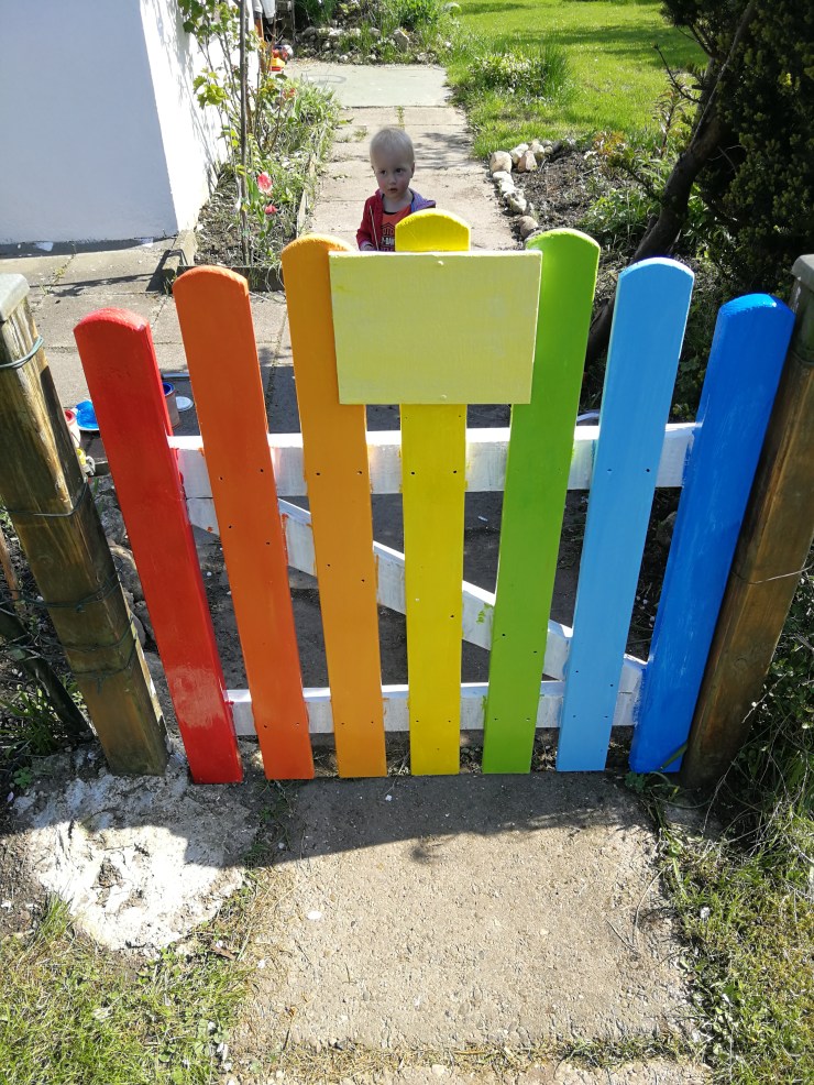 Und dann wurde gestrichen. In der Zwischenzeit hatte ich mir vorgenommen das Tor in Regenbogenfarben zu streichen. Damit die Farben auch gut raus kommen, habe ich also das Tor einmal komplett weiß grundiert. Wenn die Hütte nicht schon weiß wäre, dann hätte das bestimmt ganz gut ausgesehen. Aber so sah das doch ganz schön griechisch aus *Lach*!