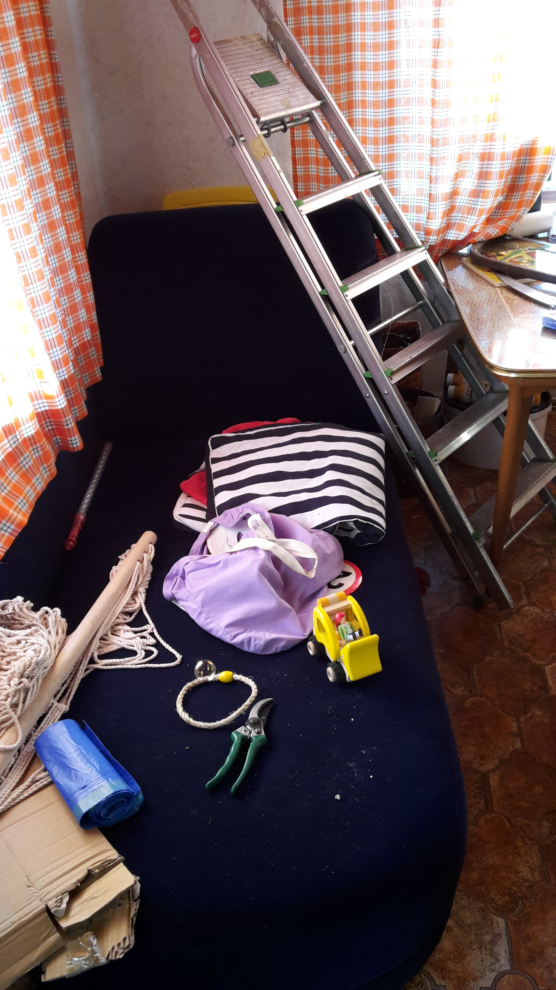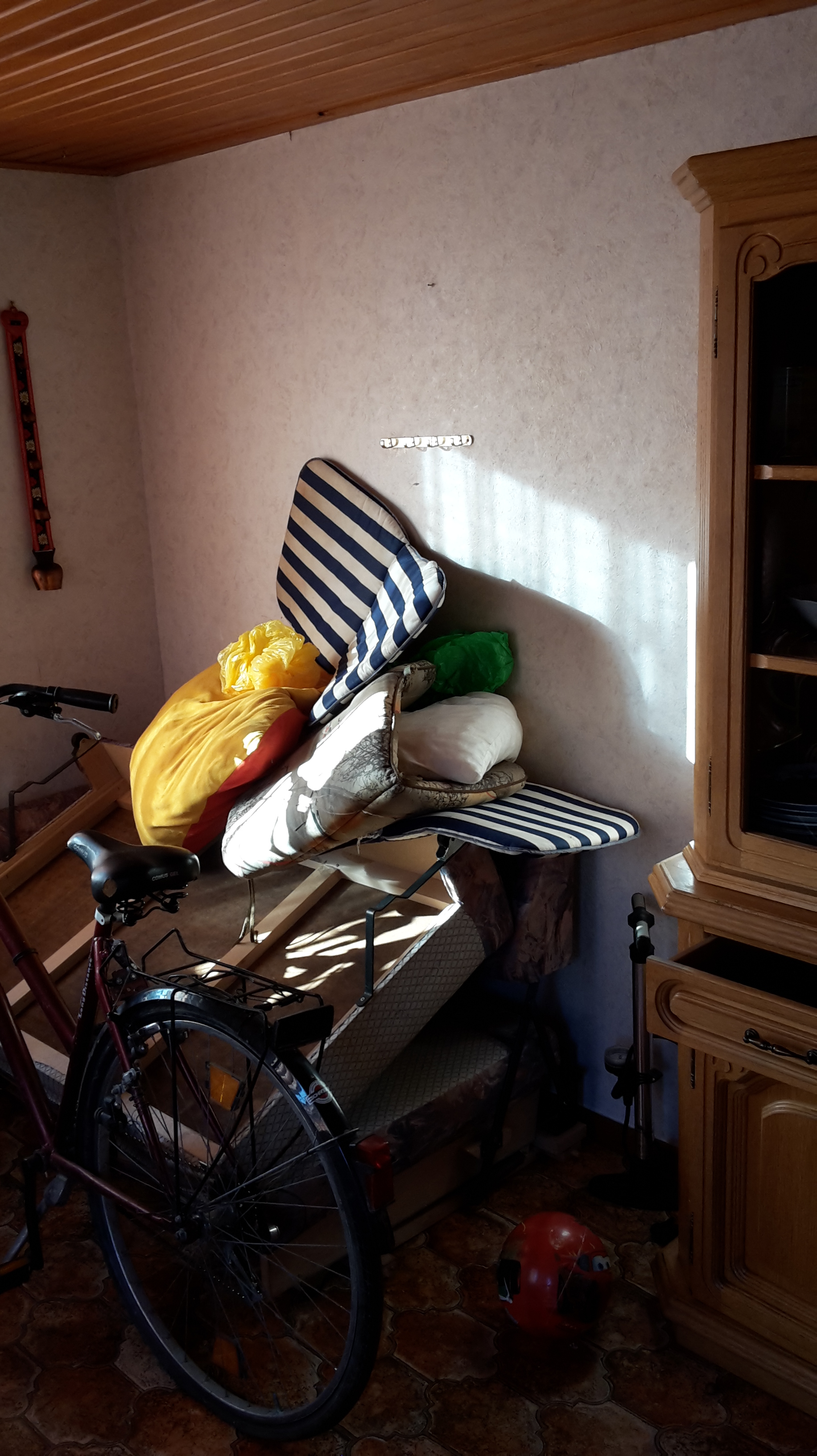 So sah es vorher in der Hütte aus: ein kaputtes Schlafsofa, Fahrrad, Polster… als andere als gemütlich