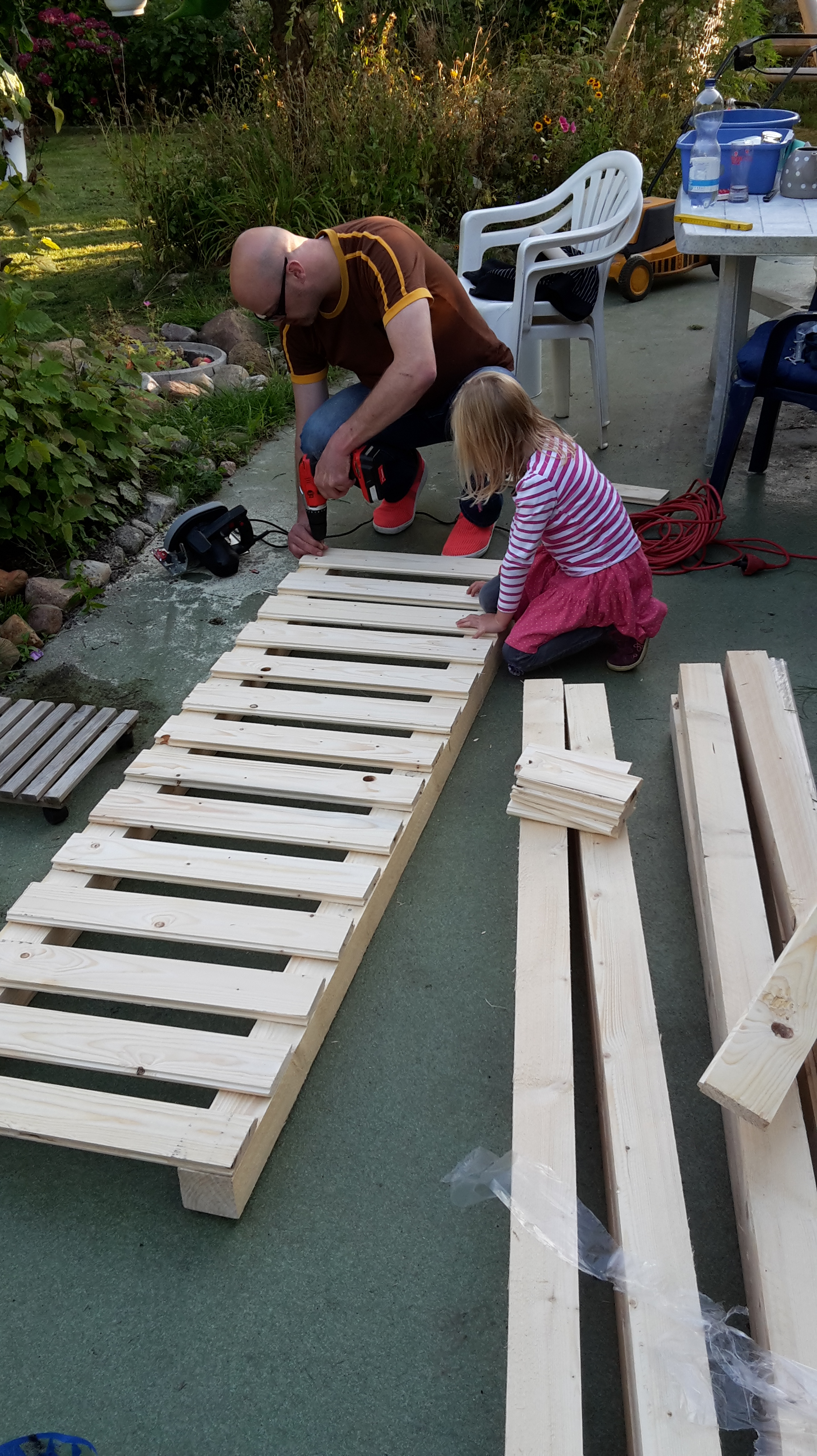 Recht zügig und hochschwanger haben wir 3 Holzbänke aus Kanthölzern gebaut. Mein lieber Mann hat mich damit fast ein wenig überrumpelt, denn ich hab es ja gerne mit ein wenig Plan und Sinn dahinter. Aber gut, er war motiviert und das wollte ich nicht bremsen 😉