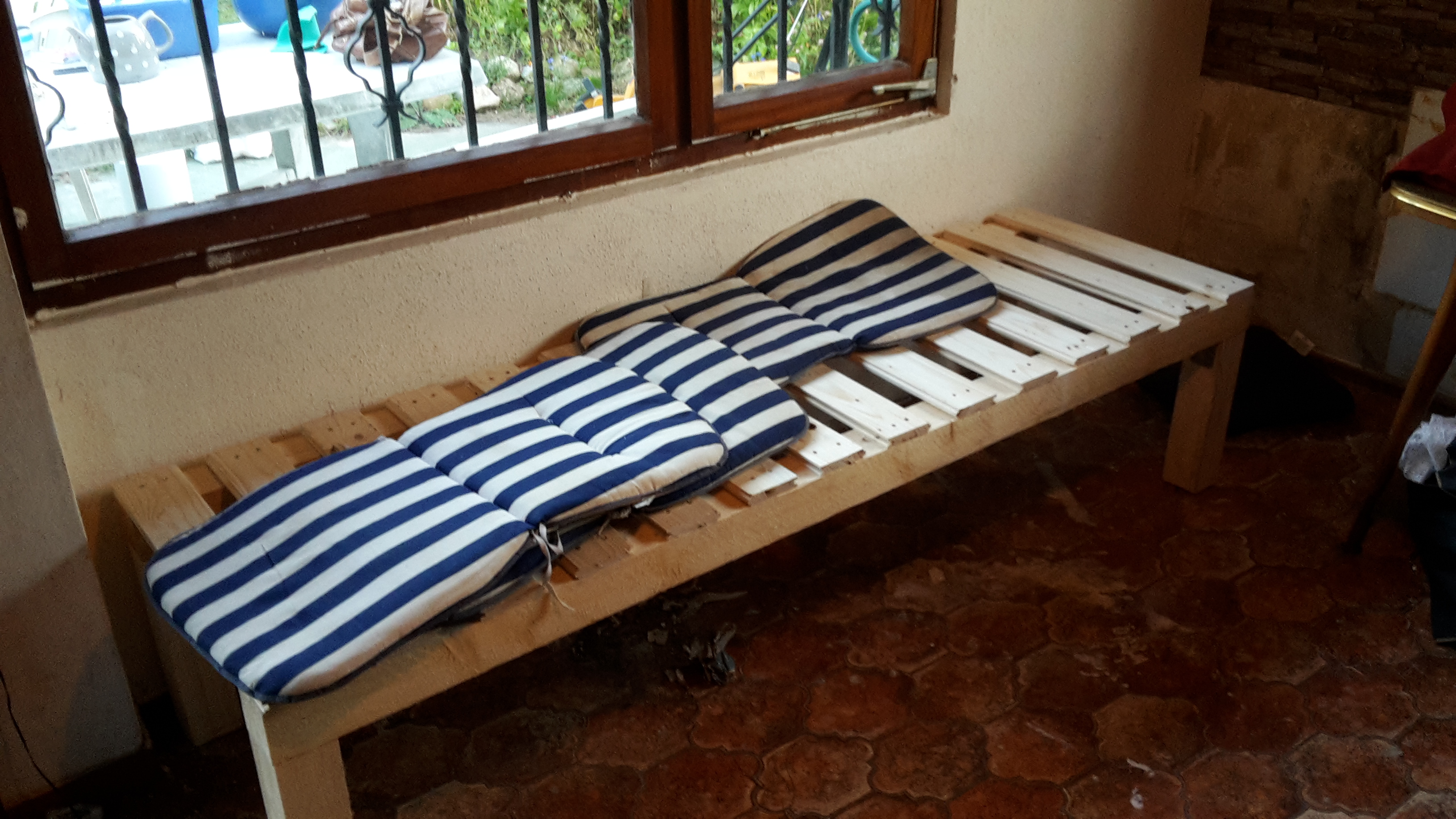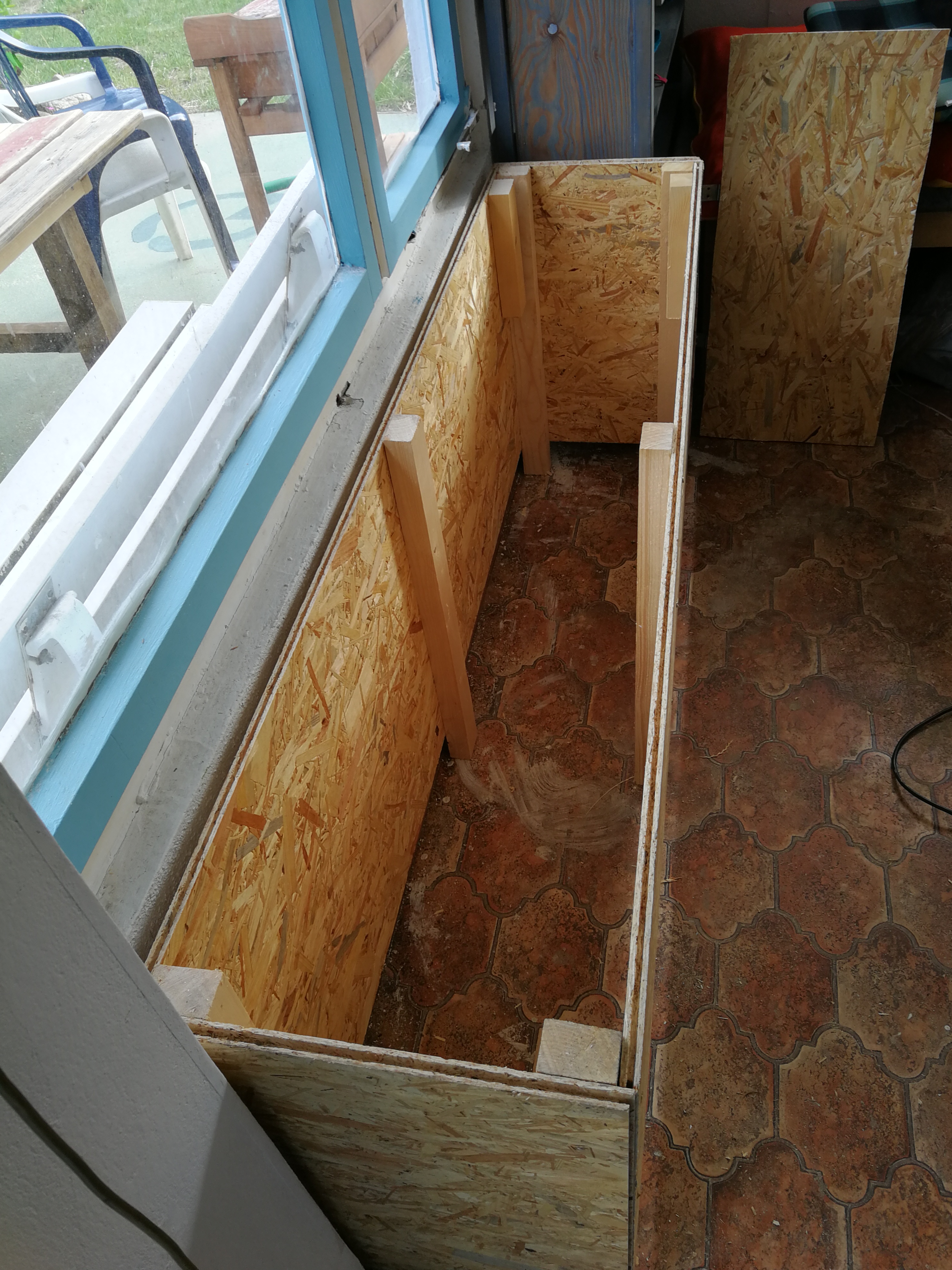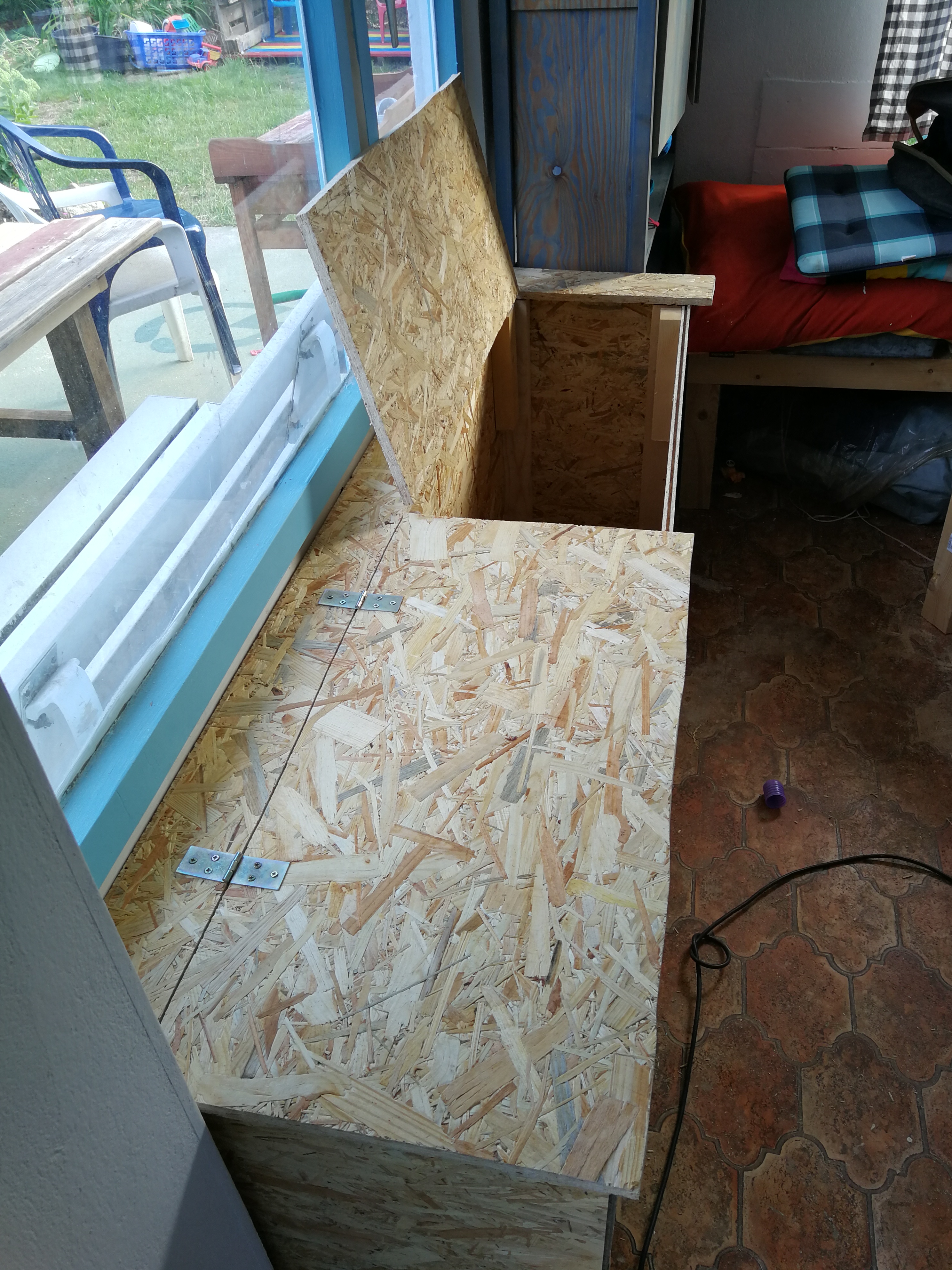 Eine der 3 Bänke. Wie man sieht, ist die irgendwie zu kurz um die ganze Seite abzudecken, aber auch zu lang für die anderen Bänke. Ich war noch nicht zufrieden