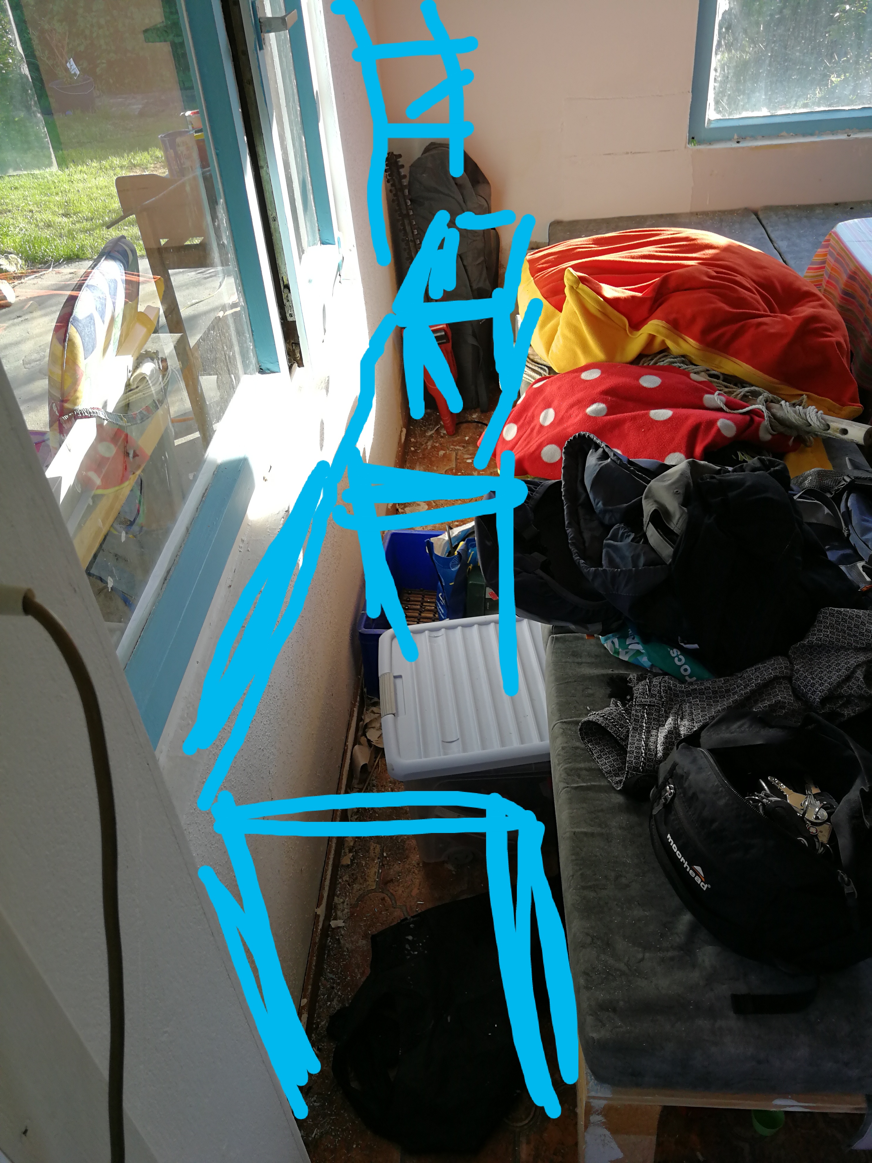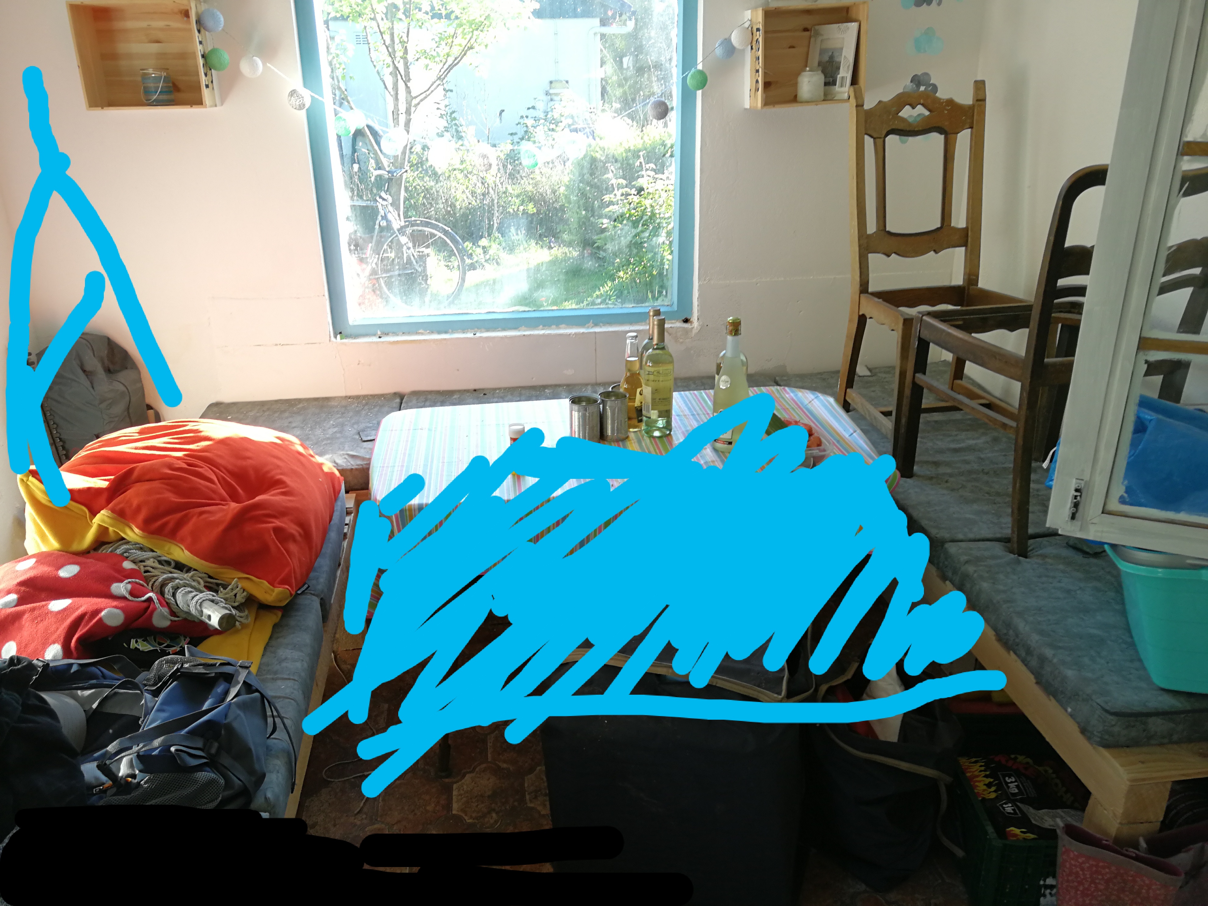 Logisch oder? Sowas mache ich gerne abends mal schnell auf dem Handy 😀 Idee im Kopf, Foto raus gesucht und raufgekritzelt 😀 Diese Box so fand ich ja schon mal ganz gut, aber wir hatten ja immer noch kein Bett. Voraussetzung natürlich platzsparend und einfach zum umbauen. Also habe ich Halterungen an die Bänke gebaut und darauf liegen dann OSB Platten. Die sind in der selben Breite wie die Bänke und liegen bei Nichtgebrauch einfach auf den Bänken und stören so niemanden. Wie das vorher in meinem Kopf ausgesehen hat? So!