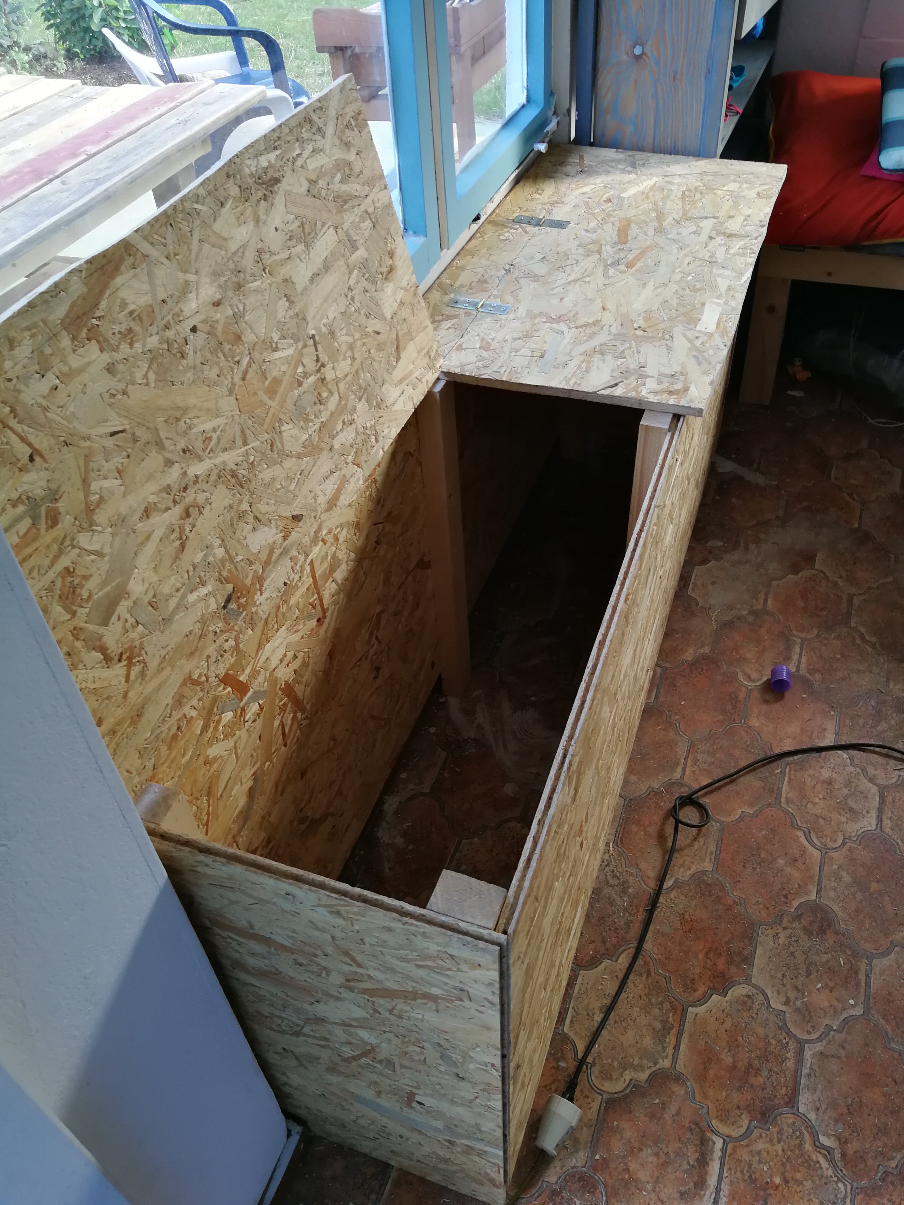 Früher gabs doch mal diese tollen Fliesen-Couchtische, die man hoch-und runter kurbeln konnte. Sowas wäre jetzt auch praktisch gewesen. Der Tisch auf dem Bild kann das auch, allerdings geht der nicht tief genug runter. Ich fürchte, der würde dann auch einfach unter unserem Gewicht zusammen brechen 😀 In der Galerie am Ende seht ihr meinen kleinen Bau Prozess. Ich hab erst die Box zusammen geschraubt, denn daran muss ich ja die Bänke ausrichten. Und wie das dann immer so ist, gibt es doch immer kleine Fehler. Unten an der Box ist nun ein Strefen frei, weil ich mich wohl vermessen hab 😀 Genau wie am Ende der Box jetzt ein unbeweglicher Streifen ist, weil das irgendwie nicht so ganz gepasst hat. Ich finds aber nicht so wild. Gerade bei den Klappen find ich das sogar gut, dass ich am Ende noch was abstellen kann. Man muss ich halt nur zu helfen wissen 😀 Das Bett hab ich dann danach angepasst. Ich hätte natürlich die Bretter auch andersrum legen können, dann hätte ich mir ein Kantholz gespart, aber dann wären die zu breit für die Bänke gewesen. Die Halterungen für die Kanthölzer werde ich wahrscheinlich nochmal etwas anpassen. Aber fürs erste geht das so und reicht uns.