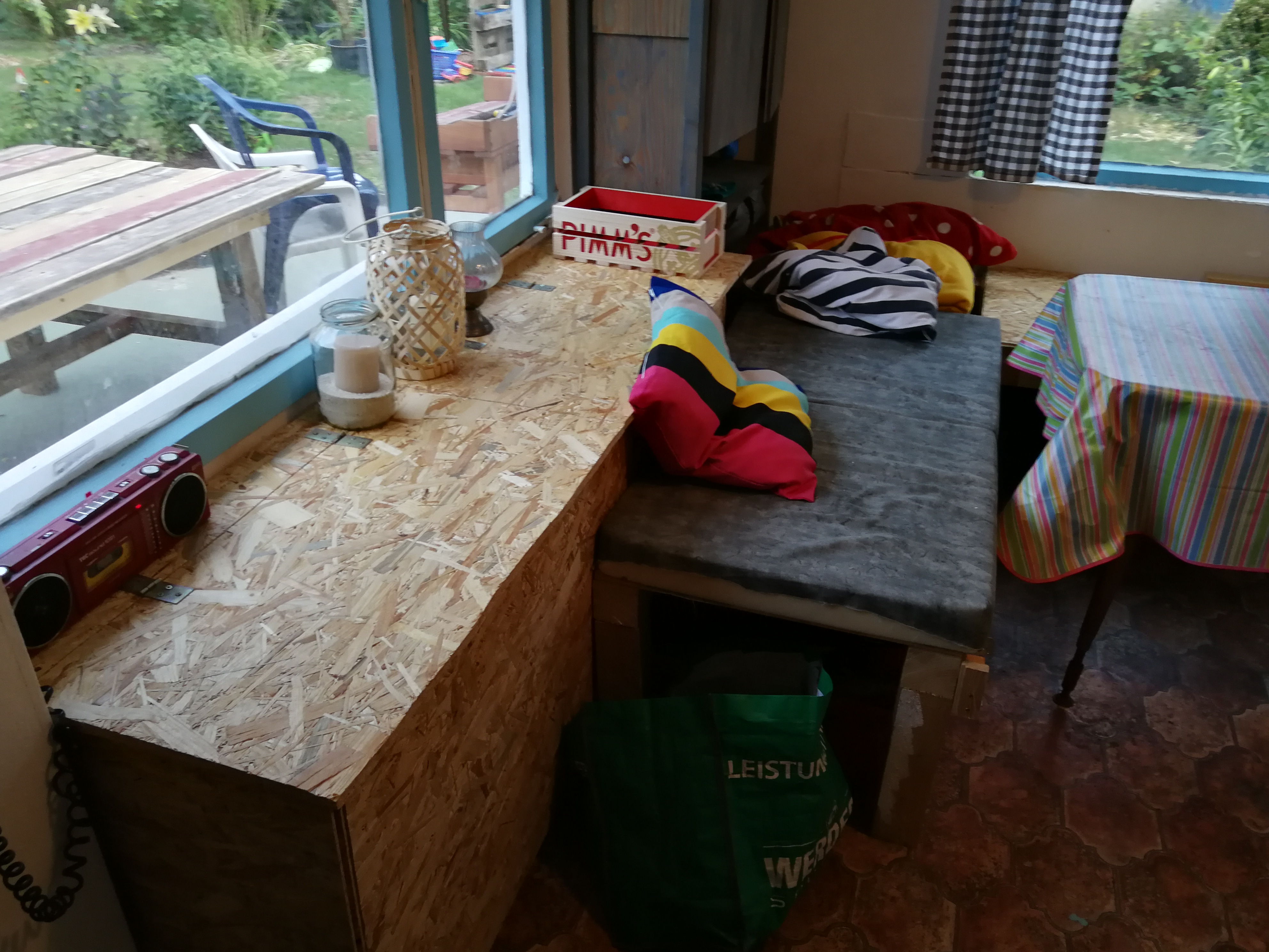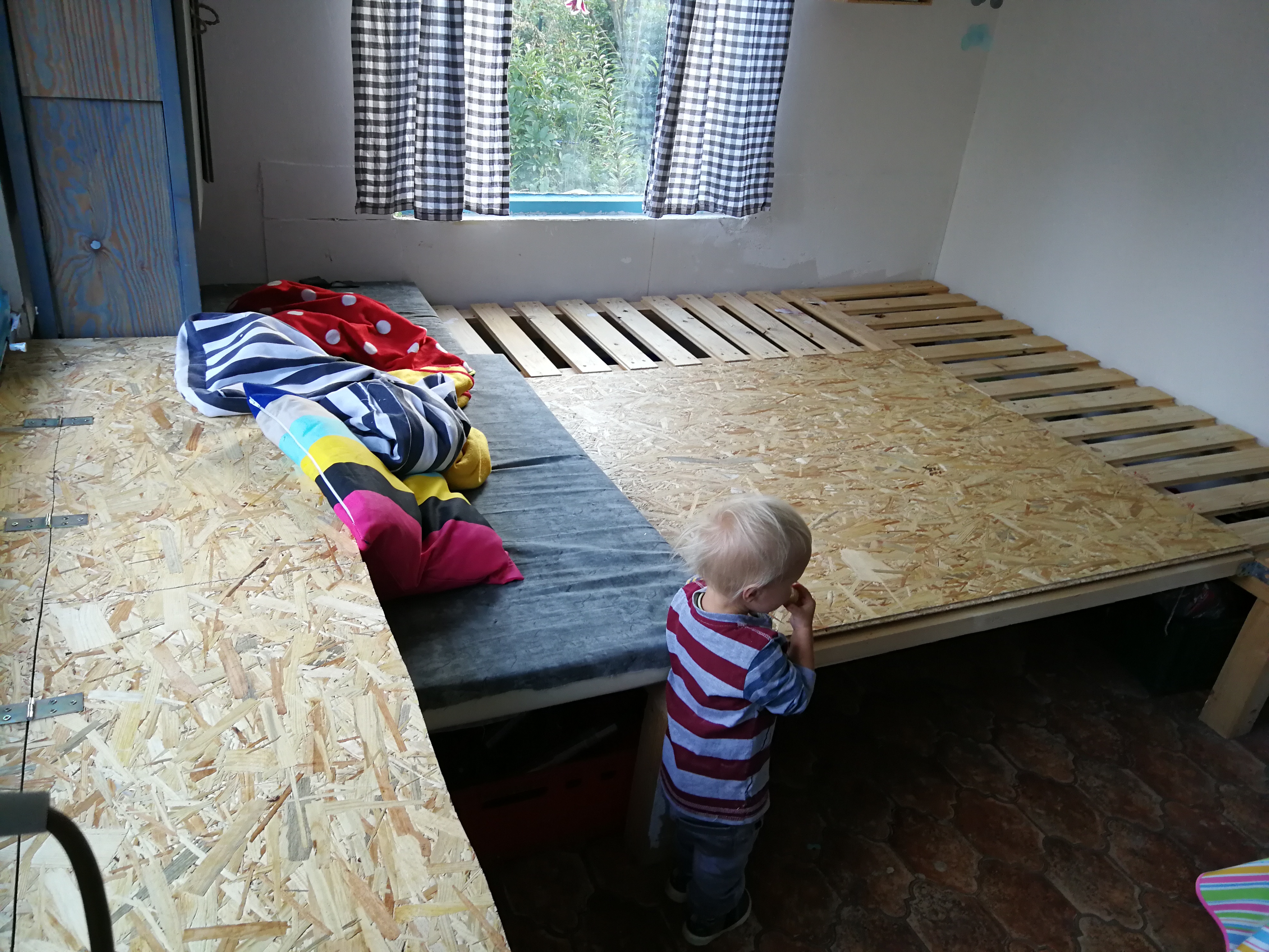 Wir hatten nun also diese 3 gleich langen Bänke in der Hütte stehen. Zum mal eben rum schieben waren die zu lang, zum so stehen lassen irgendwie zu doof, und so richtig zufrieden war ich damit nicht. Aber fürs erste konnten wir uns drinnen hinsetzen und Kisten mit Gartenkram (Unkrautvlies etc) unter die Bänke schieben. Dennoch: Ich wollte ja irgendwann mal mit den Kindern in der Hütte schlafen, bzw. nach netten Abenden mit Freunden und (zu viel) Wein, einfach mal da bleiben – gleichzeitig hatte ich aber auch keine Lust (mit betrunkenem Kopp) die Bänke hin und her zu schieben… Und so hab ich Pinterest rauf und runter gesucht und geschaut wie das in Tiny Houses, Camper oder Bullys gelöst wird. Ein Mix aus alldem ist letztendlich entstanden.