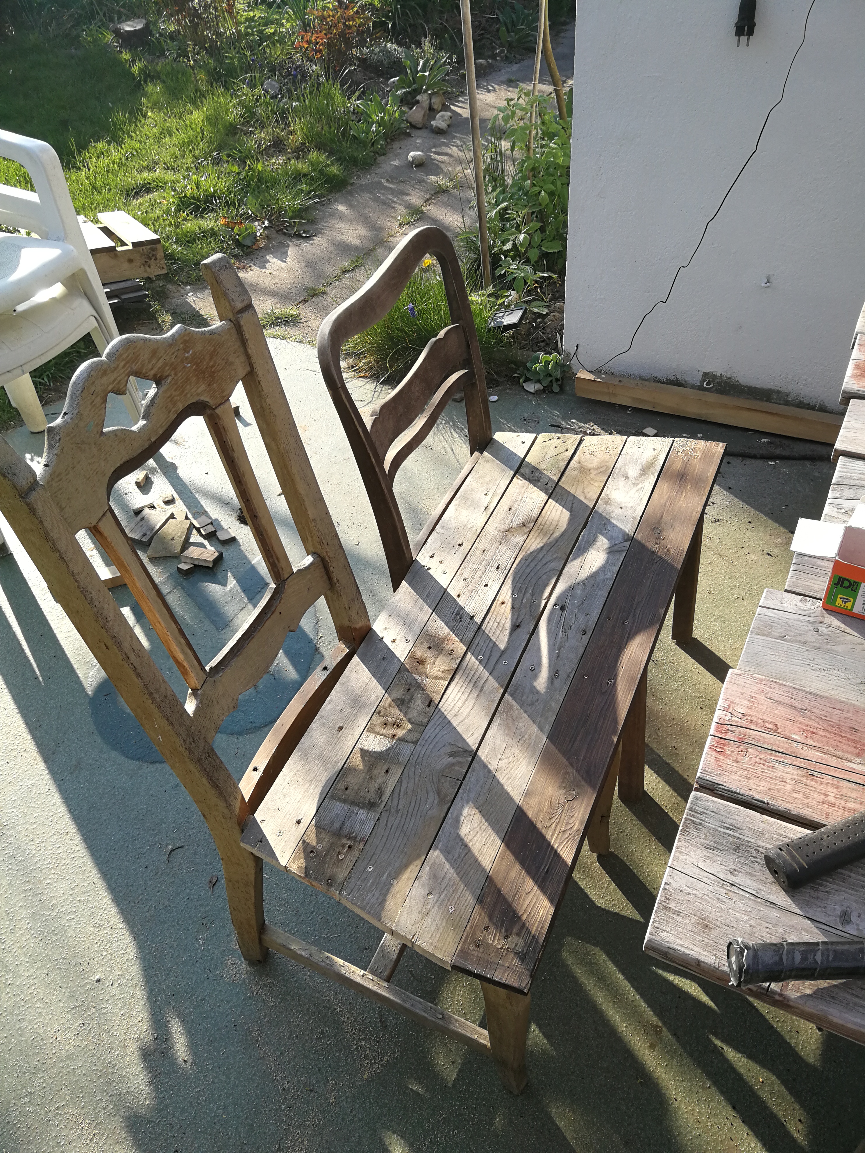 Die Idee stand fest, und musste nur noch umgesetzt werden. Schnell ein paar passende Latten aus dem Holzfundus geholt und geschaut wie man das so hinkriegt. Der eine Stuhl ist leider etwas höher als der andere gewesen. Im Internet hab ich vorher immer gesehen, wie das an der Sitzfläche angepasst wurde. Meist mit Abstandshalter, die die fehlende Höhe ausgleichen. Hab ich auch ausgetestet und für doof empfunden… Ich hab einfach die Stuhlbeine abgesägt 😀 Ganz nahc Petersilie-Manier: Grob gemessen, grob gesägt, fein angepasst 😀 Passt, wackelt, hat Luft 😀