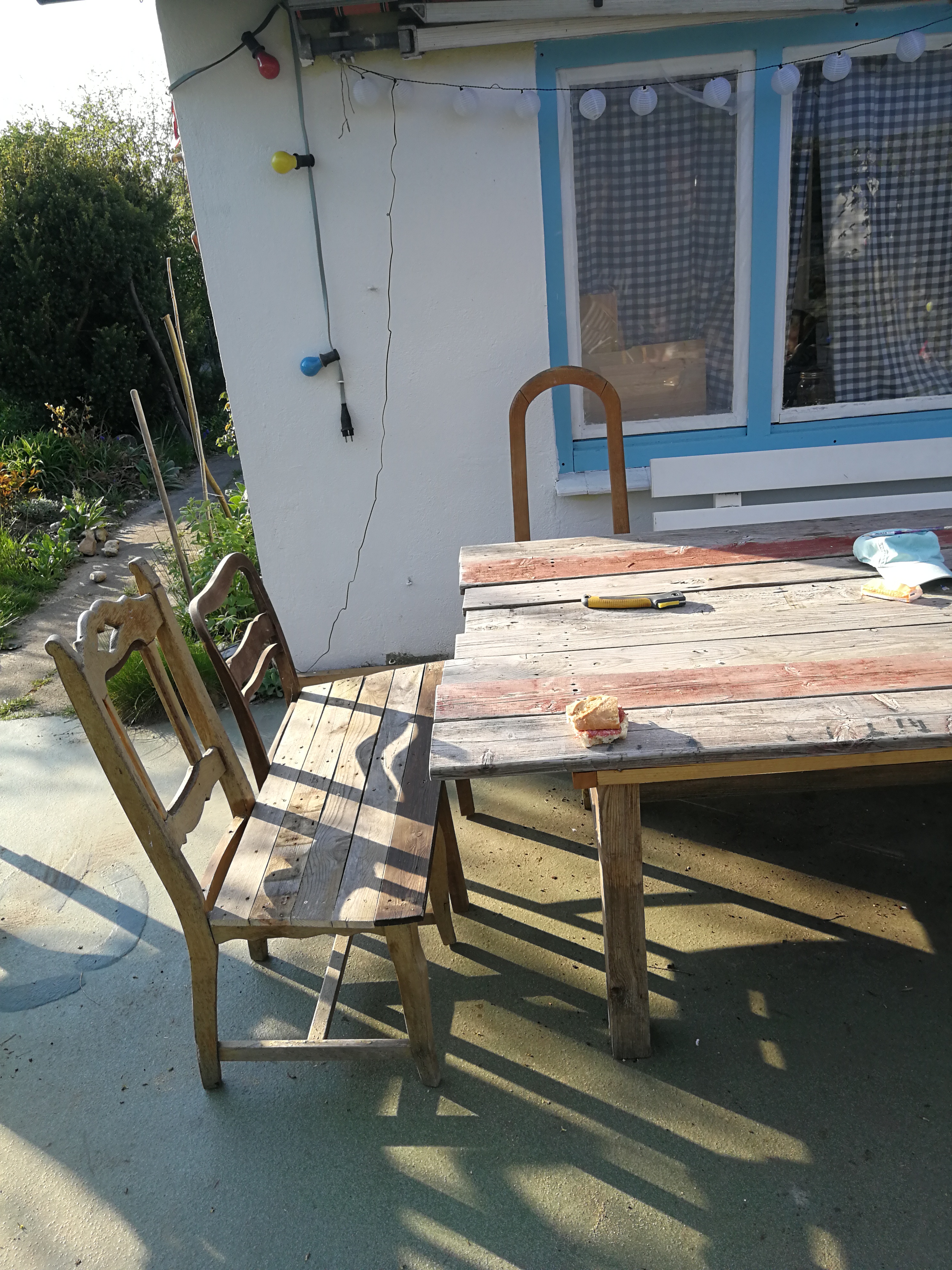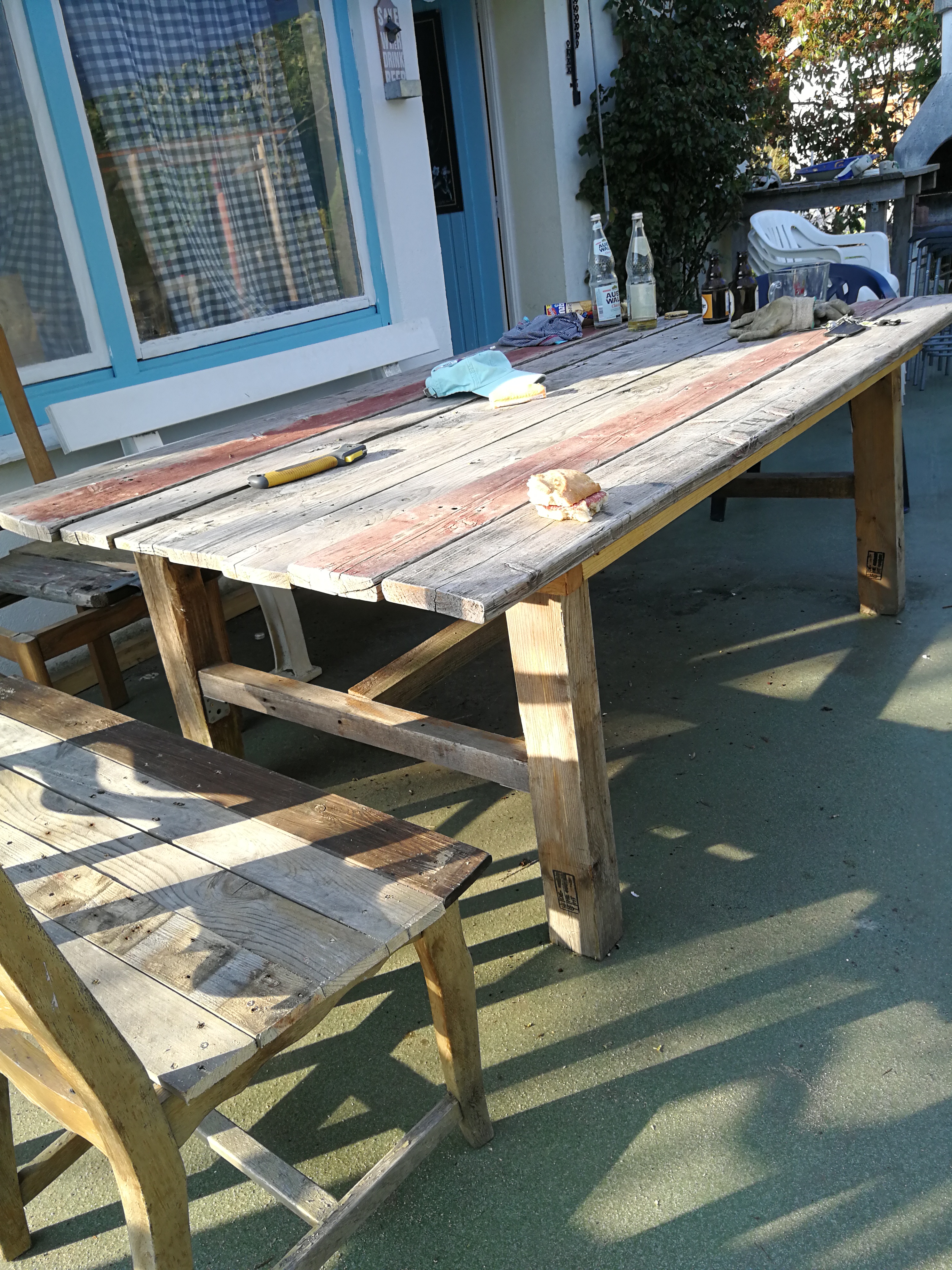 Während ich also so auf meiner Liege lag und mir meinen hübschen Holztisch so ansah, dachte ich, dass eine Minibank am Kopfende doch mal wirklich Sinn macht. Wir haben viele stapelbare Plastikstühle, die zwar bequem und praktisch sind, aber nicht wirklich schön. Ich würde die auch echt gerne ersetzen, aber so ein Schwung schicker Holzstühle ist mir zu teuer. Als ich den Holztisch letztes Jahr gebaut habe, hab ich den ja auch mit Absicht so breit gemacht, dass all unsere Freunde PLUS Salatschüsseln PLUS Getränke PLUS Deko (das muss jemand anderes übernehmen. ich bin ne Deko-Niete) darauf Platz finden. So ist nun allerdings auch das Kopfende vom Tisch etwas breiter, aber zwei Plastikstühle nebeneinander sind dann doch zu viel. Aaaaber zwei Holzstühle, die zur Bank werden sind perfekt. Perfekt für 2 Erwachsene, aber auch für 2 Kinder 😀